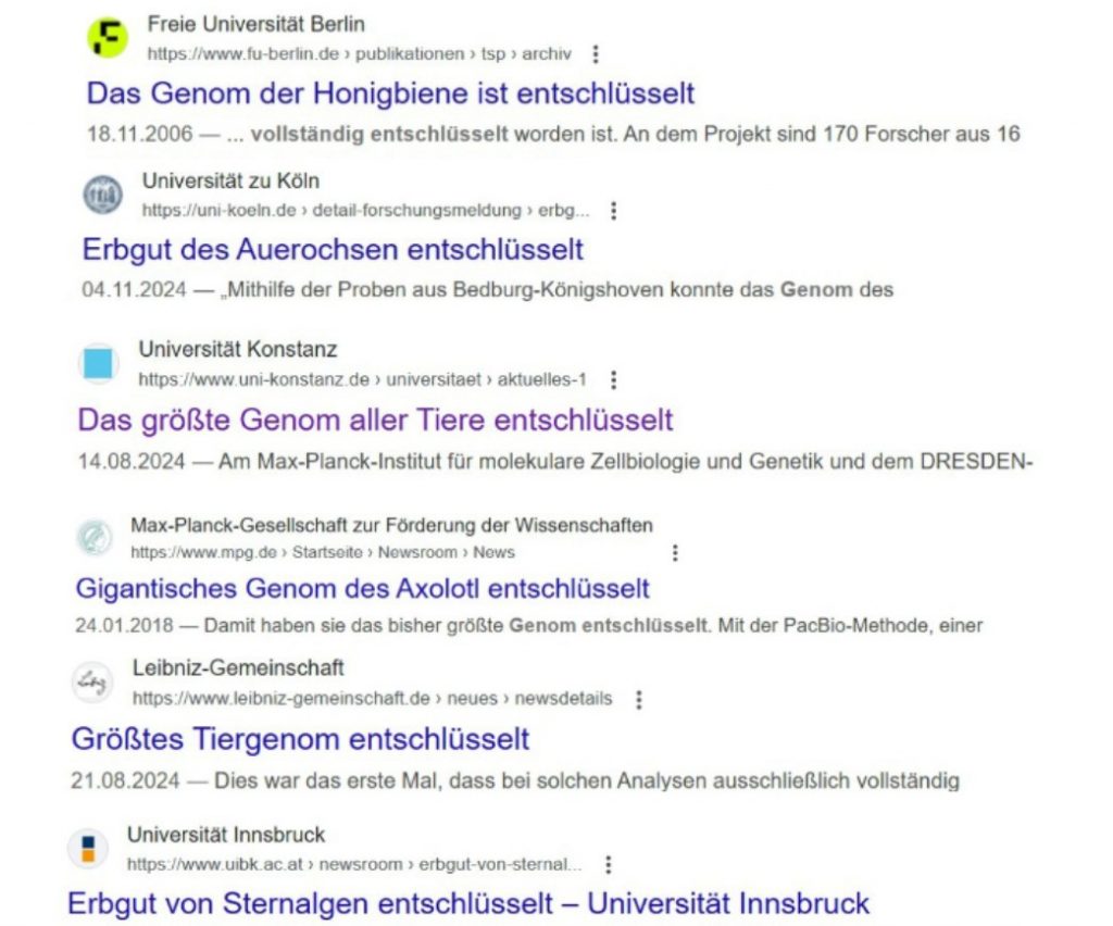 Aktuell lässt sich die Funktionsweise dieser unterbewussten psychologischen Mechanismen an scheinbar zufälligen semantischen Fehlern erkennen. So wird die unbeherrschbare Komplexität der über viele Millionen Jahre der Evolution in den Genomen von Lebewesen angehäuften und abgespeicherten, in sich verwobenen Informationen durch öffentliche Falschmeldungen überdeckt, nach denen der Mensch ganze Genome „entschlüsseln“ könne. Vertauscht wird hier der Begriff der „Entschlüsselung“, welcher die Erkennung aller abgespeicherten Informationen bedingen würde, mit dem eigentlich korrekten Begriff „Sequenzierung“. Dieser bezeichnet aber nur das bloße Auslesen der Reihenfolgen der Nukleotide im Genom ohne Bezug zur Entschlüsselung der darin liegenden Informationen. Und viel mehr ist auch nicht passiert. Mit der angeblichen Entschlüsselung ganzer Genome wird also erneut eine (in der Realität ausgeschlossene) Beherrschbarkeit der belebten Natur durch den Menschen suggeriert. Folgende Abbildung zeigt Beispiele der vermeintlich zufälligen semantischen Fehler durch etablierte Forschungseinrichtungen: